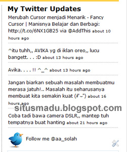 Keterangan : silahkan tulisan aa_solah berwarna merah diganti dengan ID Twitter sobat. selamat mencoba Memasang Widget Status Terbaru Twitter pada Blog