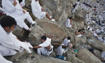 | Seorang jemaah haji di atas memberi bantuan pada jemaah lainnya yang masih berada di bawah untuk mendaki bukit saat melaksanakan ibadah wukuf di Padang Arafah, Senin (14/10). |