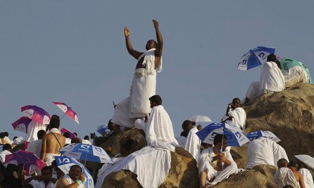 | Seorang jamaah haji berdiri sambil berdoa di atas sebuah batu saat menjalankan ibadah wukuf di Padang Arafah, Senin (14/10). |